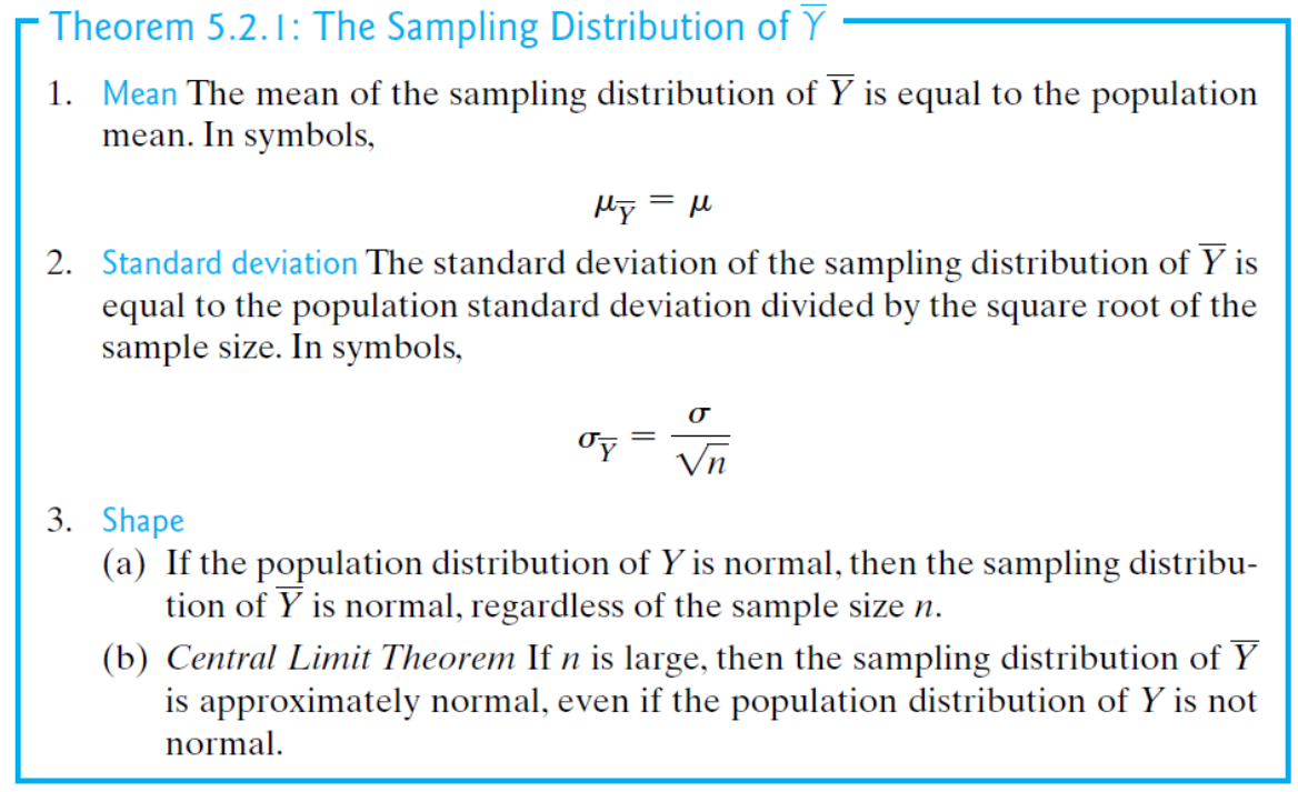 Sampling distribution: A probability distribution that describes sampling variability in \(\bar Y\).