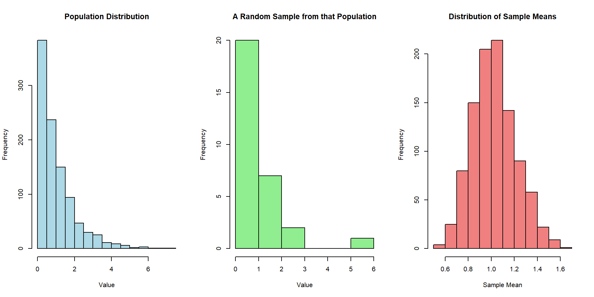 The Central Limit Theorem states that, no matter what distribution Y may have in the population, if the sample size is large enough, then the sampling distribution of \(\bar{Y}\) will be approximately a normal distribution.