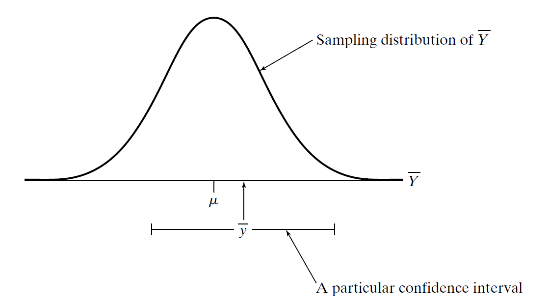 Sampling Error: the amount of discrepancy between \(\bar{y}\) and \(\mu\) is described (in a probability sense) by the sampling distribution of \(\bar{Y}\)