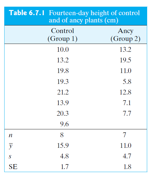 In one such study, 7 plants were treated with the substance Ancymidol (ancy) and were compared to 8 control plants that were given ordinary water. Heights of all of the plants were measured, in cm, after 14 days of growth.