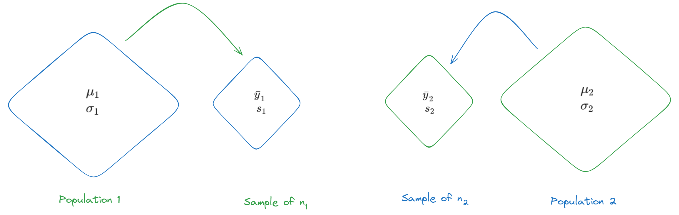 Naturally, we can say that taking the difference between two sample means is an estimate of the quantity (\(\mu_1\) - \(\mu_2\)).