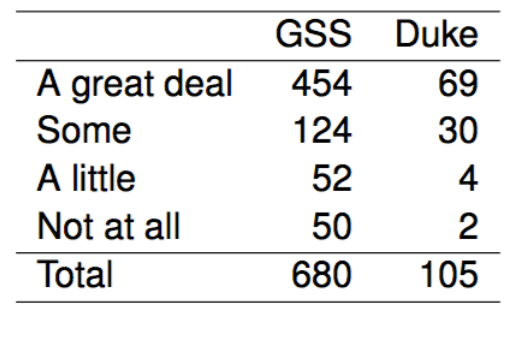 The GSS asks the same question, below are the distributions of responses from the 2010 GSS as well as from a group of introductory statistics students at Duke University: