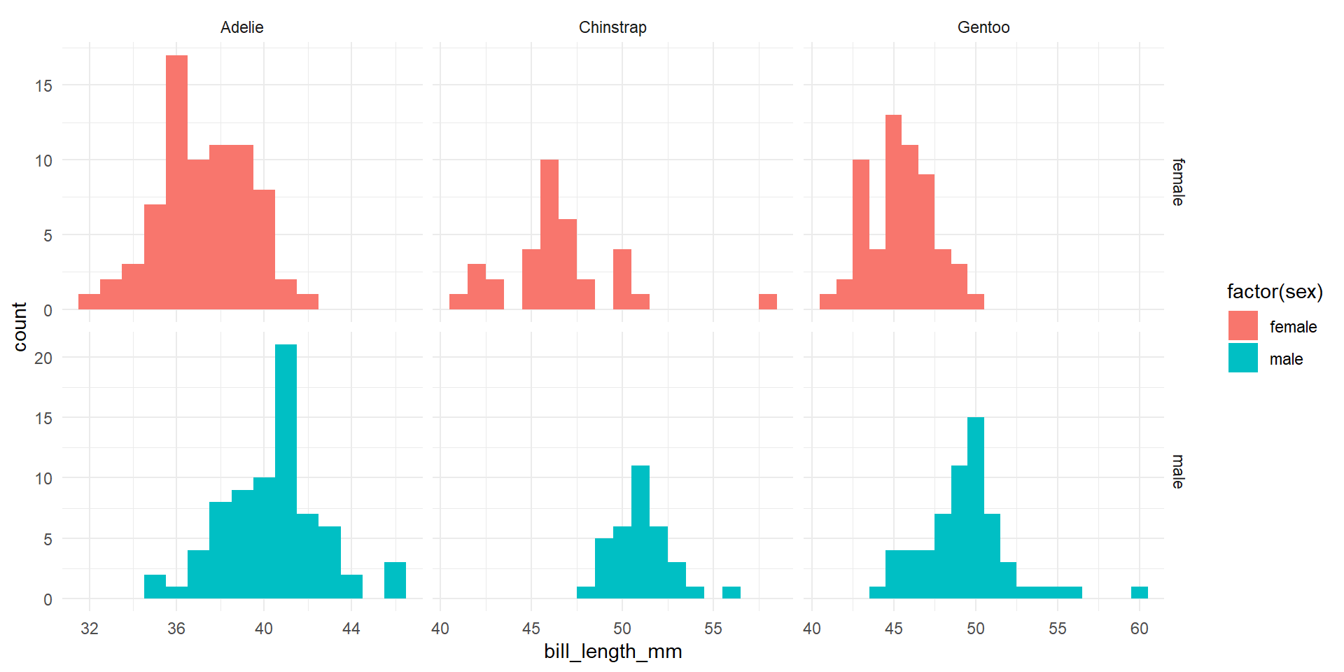 ggplot(aes(x = bill_length_mm, fill = factor(sex))) +